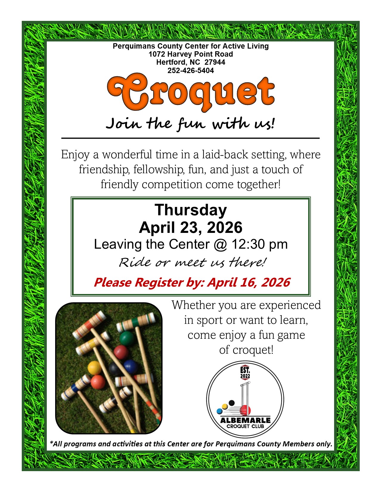 | Thu Apr 23 @12:30PM Croquet |